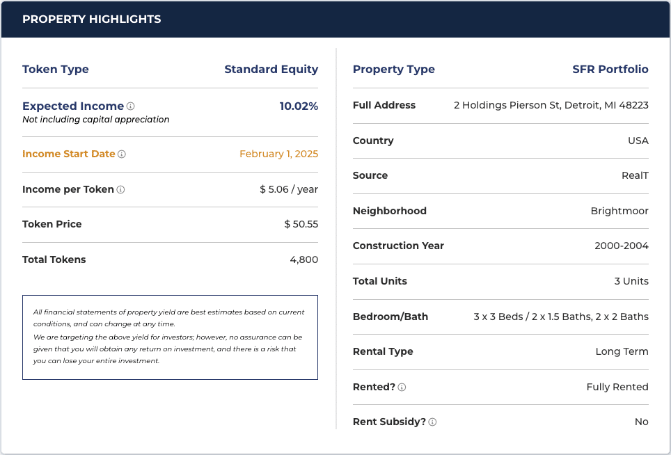 Pour rappel, RealT est une plateforme qui permet d’investir dans des fractions de 50 $ de biens immobiliers aux États-Unis grâce aux cryptos. Les rendements sont compris entre 8 % et 11 %, avec une moyenne à 9,5 %.